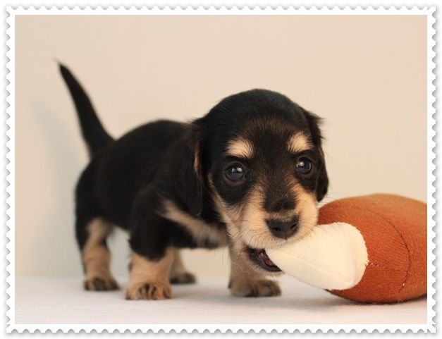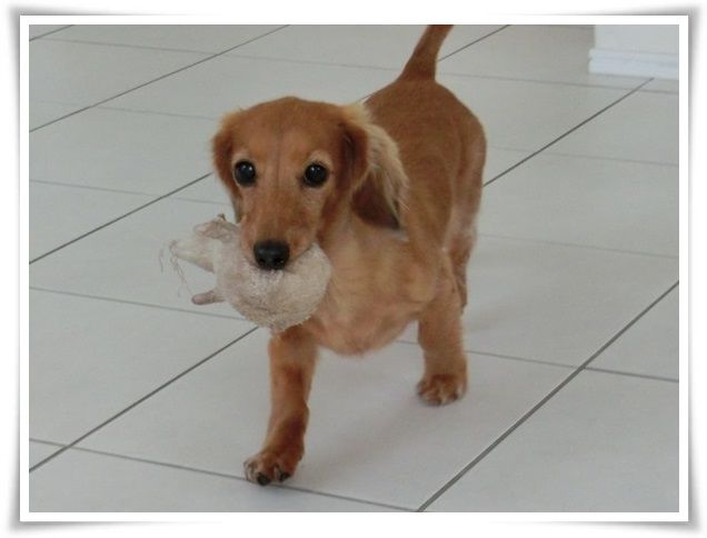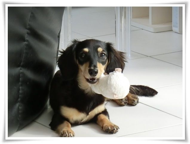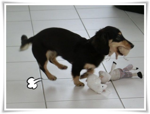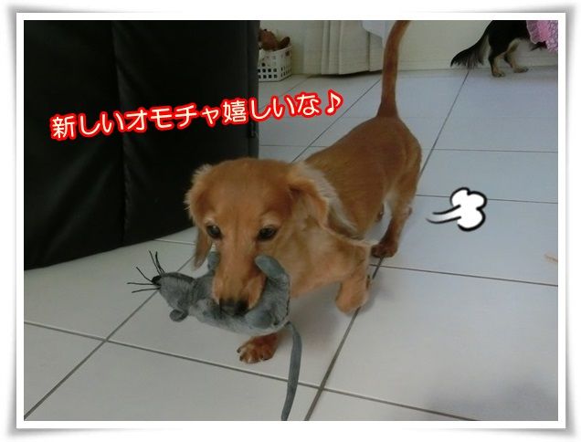 興奮してオモチャを咥えて走り回るメリア。