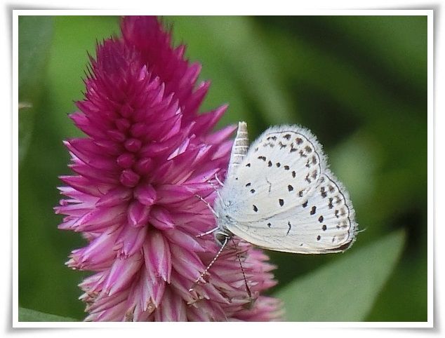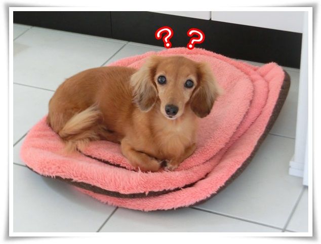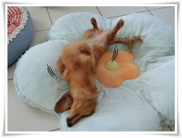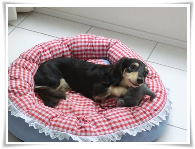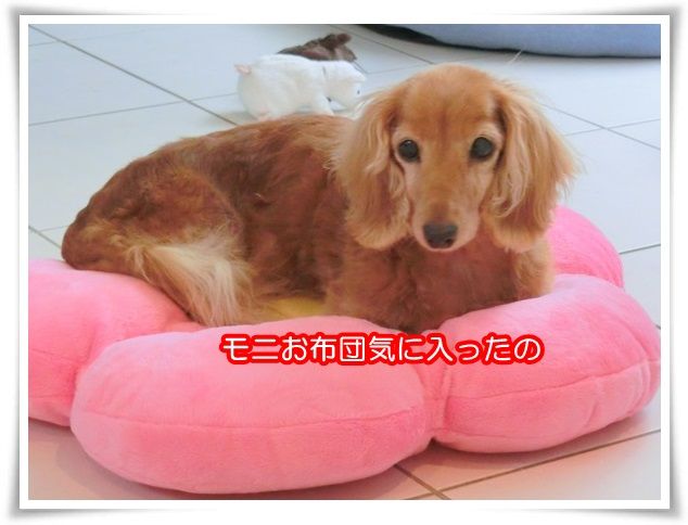 ちんまりと小さなお花のお布団に収まっているモニ。