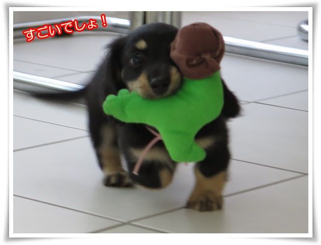 誰にも邪魔されないところまでオモチャを運んでいます。