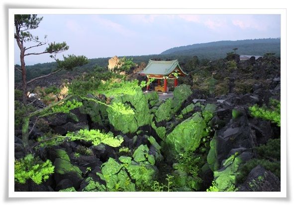 緑のライトが岩肌を照らして、まるで光る苔が生えているかのように見えます。
