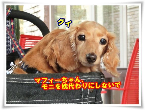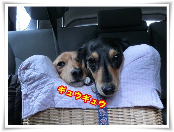 後ろの座席で情けない顔をしているマフィー&マノン。