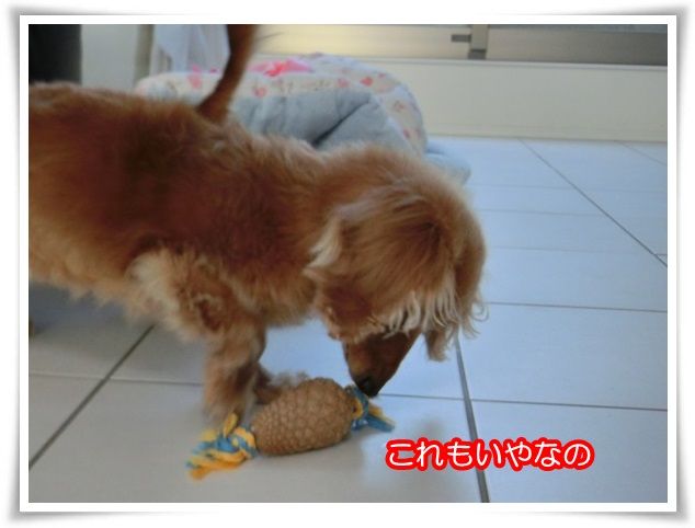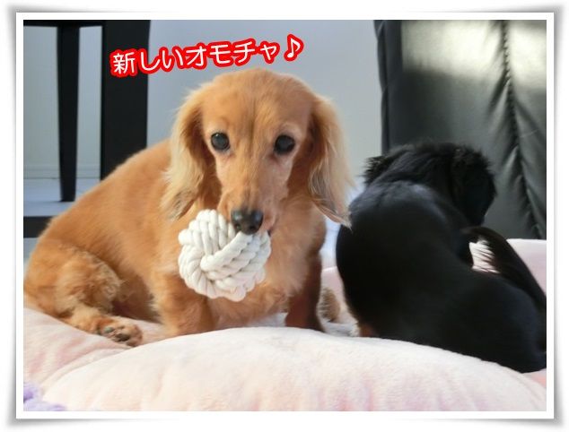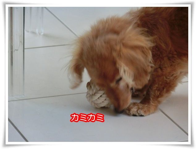 しばらくすると、ソファーの陰に隠れてロープのボールをカミカミしている姿が。。。