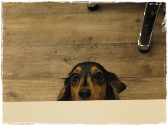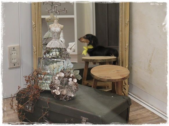 トリミングルームの鏡に映ったマノンが見えました。