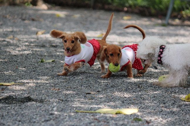ワンズ、ドッグランに放たれると早速、ボール遊びしているお友達のところに仲間入り。。。